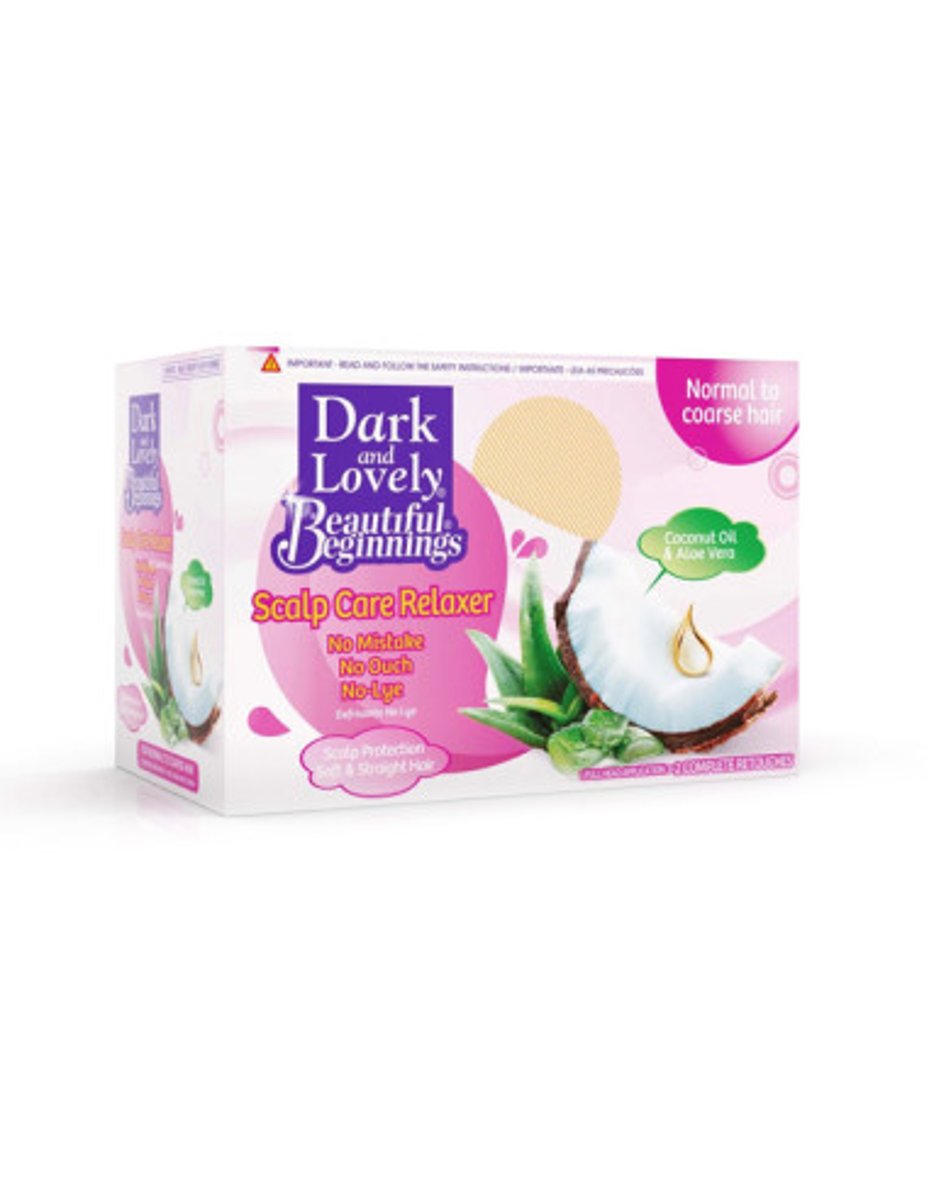 Nosso Dark and Lovely Beautiful Beginnings Scalp Care No Lye Relaxer Kit Normal é enriquecido com óleo de coco e aloe vera para nutrir seus cabelos durante o processo de relaxamento.
