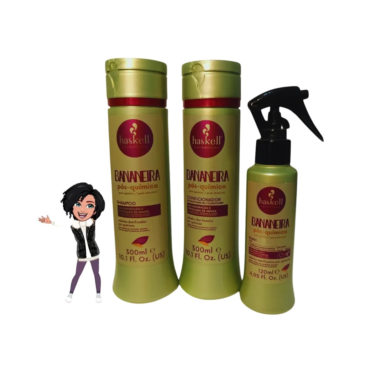 O Kit Haskell Bananeira Pós-Química foi desenvolvido especialmente para recuperar cabelos danificados por alisamentos, descolorações, colorações ou outras químicas agressivas. Composto por dois shampoos de 300 ml e um fluido restaurador de 120 ml, este tratamento promove a reposição de massa capilar, fortalece a estrutura dos fios e devolve o aspeto saudável ao cabelo fragilizado.
